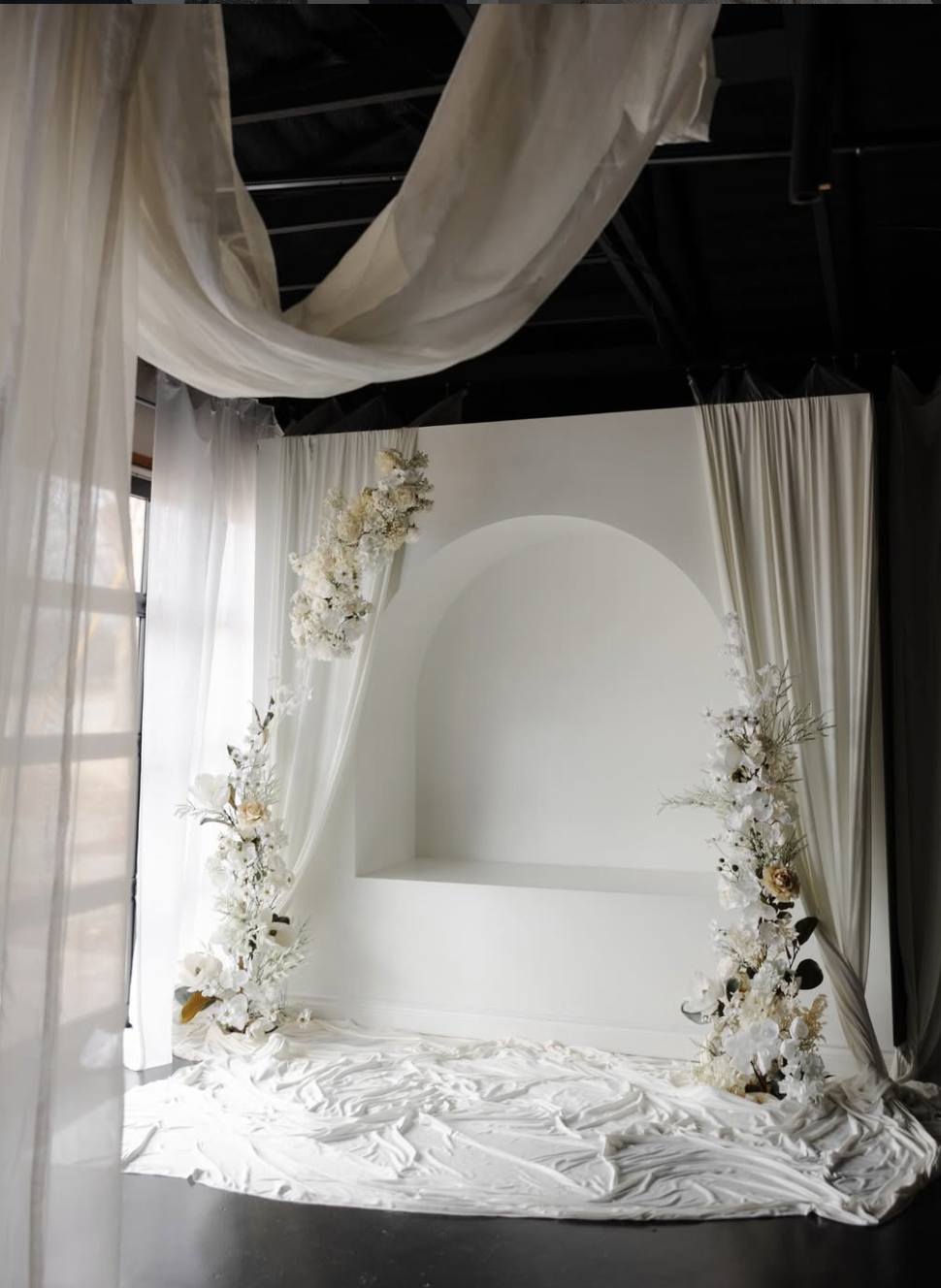 A light, romantic indoor space with cascading drapery, creamy tones, and delicate florals surrounding a soft arched backdrop. Designed to feel airy, timeless, and heirloom-inspired.